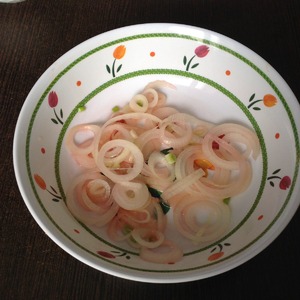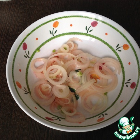 Обдаем кипятком репчатый лук и заливаем виноградным уксусом (1 ст. л.). Даем постоять 10-15 минут.