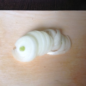 Репчатый лук нарезаем тонкими полукольцами или кольцами.