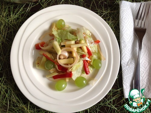 В настоящее время для приготовления салатов, плова, соуса и каш используют белый виноград. Он имеет выраженные кисло-сладкие нотки. В его кожице содержится меньшее количество сахара по сравнению с другими сортах. Именно поэтому его можно смело кушать тем, кто придерживается диеты или здорового режима питания. Сегодня я предлагаю приготовить этот любимый салат моей семьи. Готовлю его часто и всегда этот нежный, ароматный и аппетитный салат съедается на ура.