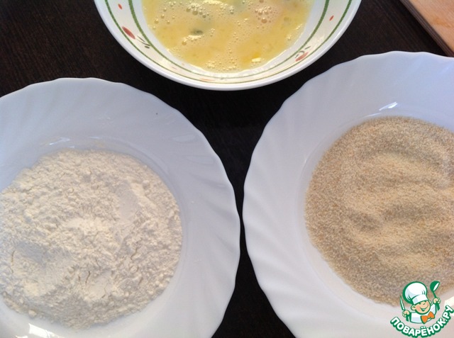 Зразы обваливаем в муке, затем окунаем во взбитое яйцо и панируем в сухарях.