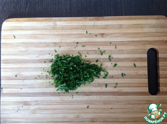 Пока фарш отдыхает, займемся начинкой. Зелень мелко нашинкуем. У меня петрушка, но можно использовать любую свежую зелень.