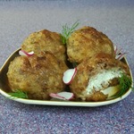 Фарш визуально делим на 8 частей. Из каждой части формируем лепешки, в центр помещаем творожные колобки и формируем зразы.
