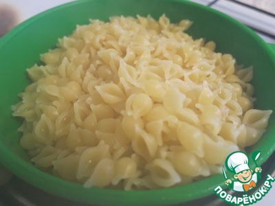 Вермишель отварите согласно инструкции, откиньте на дуршлаг и дайте воде стечь.