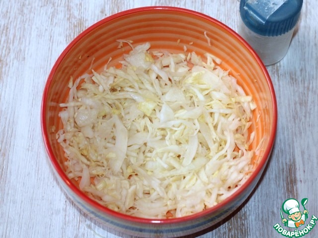 1) Очистить кочан капусты, нашинковать соломкой, посыпать щепоткой соли и помять руками. Выложить капусту на дно керамической посуды.