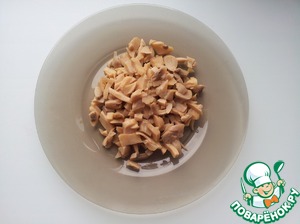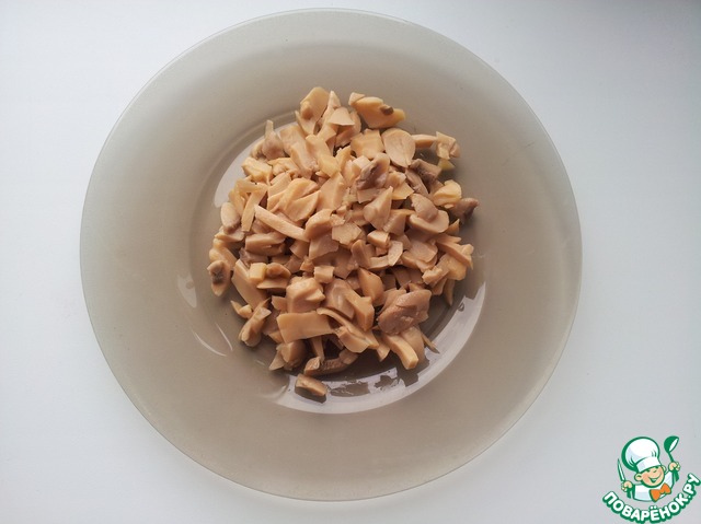 С шампиньонов слить жидкость, мелко нарезать.