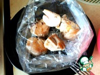 Оттаявшую куриную грудку режем на 4-6 частей. Присаливаем (но не солим!), перец по вкусу. В разогретой сковороде обжариваем до золотистой корочки кусочки с обеих сторон (но не жарим!). Снаружи курочка побелеет, шкура примет золотистый цвет, а внутри останется сырой. Обжаренные кусочки складываем в рукав или пакет для запекания.