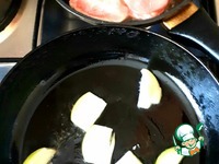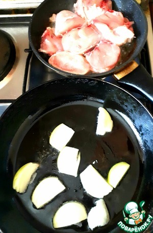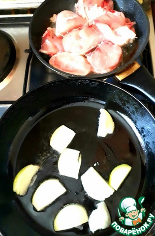 Далее включаем духовку на макс. и приступаем к овощам. Большую луковицу крупно режем и отправляем на сковороду с маслом. (Фото смежное с обжаркой курицы, т. к. делаю всегда одновременно, чтоб время не терять). Лук пассивируем до тех пор, пока он не развалится на слои (мин 2-3).