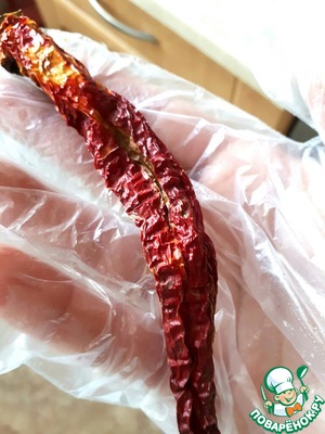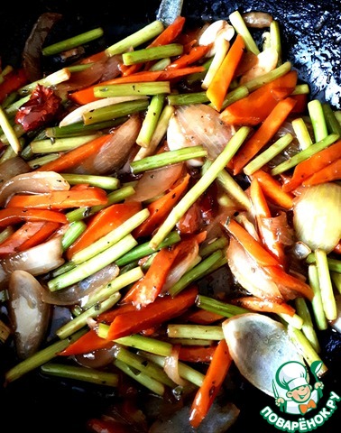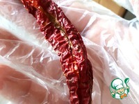 А теперь очередь "жаркой" поры. Стручок сушеного жгучего перца (у меня свой, домашний) очищаем от зёрен и крошим половину стручка в овощи. Масло к этому времени начинает потихоньку исчезать, самое время добавить 5 ст. л. соевого соуса, паприку молотую, чуть-чуть молотого кориандра (не обязательно), душистый перчик молотый, все перемешать и тушить 2-3 мин.