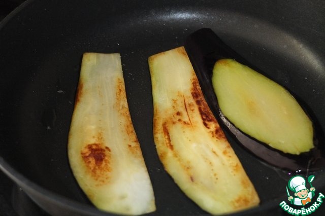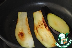 Баклажаны нарезаем тонкими полосками и обжариваем с двух сторон в небольшом количестве растительного масла.