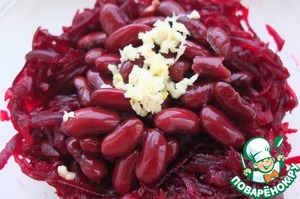Свеклу натираем на крупной тёрке, добавляем фасоль и чеснок, пропущенный через пресс.