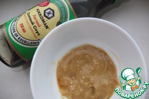 Для заправки смешиваем горчицу, растительное масло и соевый соус Киккоман "Легкий".