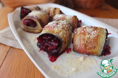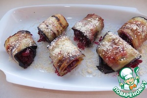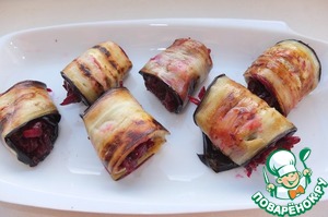 Выкладываем салат на баклажан и сворачиваем рулетом. -