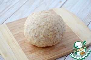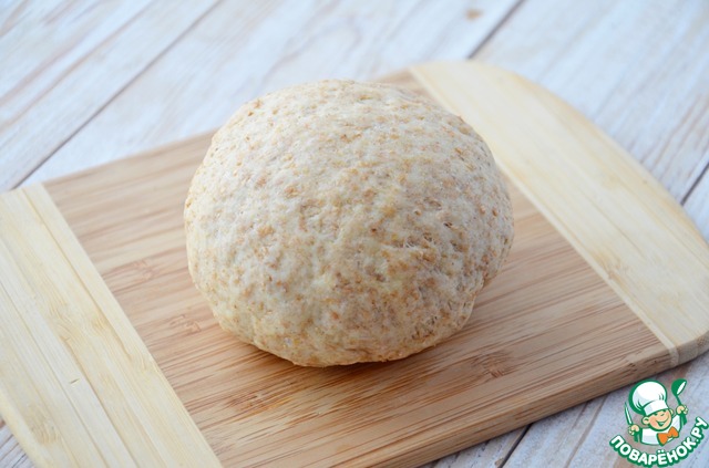 Для теста муку смешать с отрубями, разрыхлителем и солью, кипяток смешать с маслом. влить в муку и замесить тесто. Завернуть в пленку и отставить в сторонку.