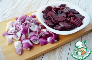 Для начинки: лук порезать крупно, свеклу пластинками.