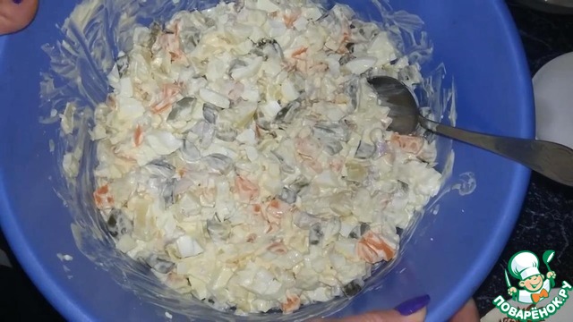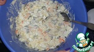 Перекладываем наши продукты в салатницу, заправляем майонезом, солим, перемешиваем. Приятного Вам аппетита!
