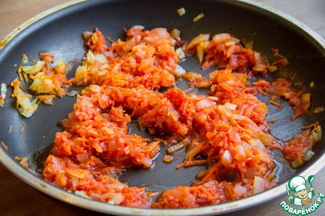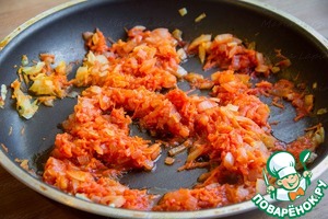 На сковороде разогреть растительное масло. Лук порезать кубиком, морковь натереть на мелкой терке, рукколу порубить. Лук обжарить до золотистого цвета, затем добавить морковь и обжаривать все вместе несколько минут. Добавить томатную пасту и 100 мл. воды, томить под крышкой на небольшом огне 7-10 минут.