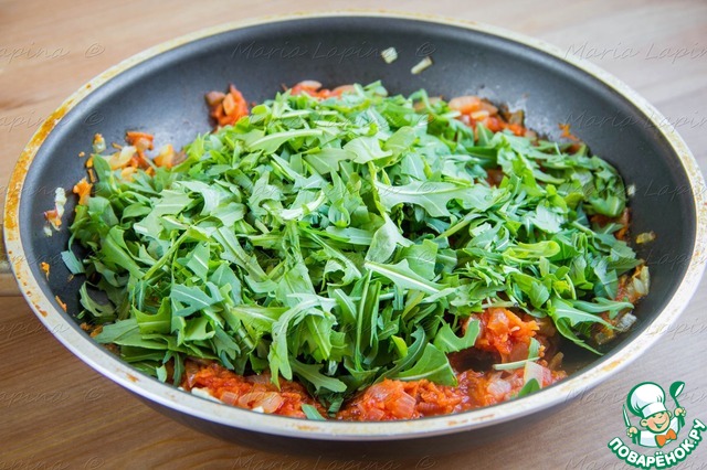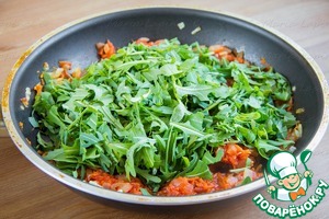Добавить в сковороду рукколу и потомить ещё несколько минут.