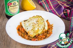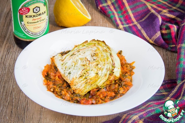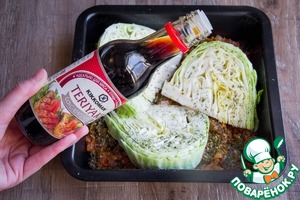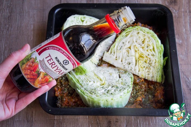 Молодую капусту нарезать дольками прямо с кочерыжкой. На дно формы выложить припущенные овощи, сверху капусту. Посыпать овощи травами и перцем. Щедро сбрызнуть овощи и капусту соусом терияки и оливковым маслом