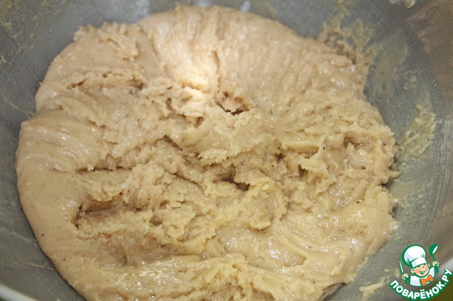 Муку смешать с разрыхлителем и просеять через сито. Влить в сухую смесь сироп.