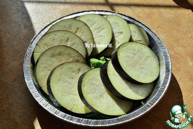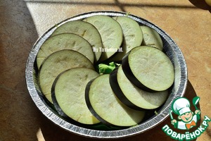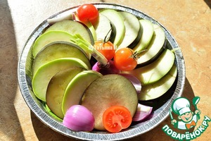 Чередуя с баклажанами, выложить кругляши кабачка, лук, черри;