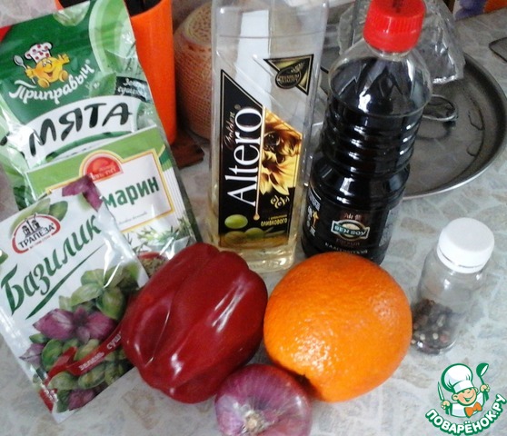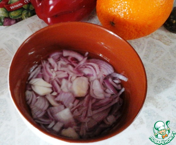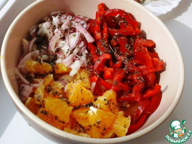 Все продукты под рукой, перец надо почистить и разрезать на 4 части. Апельсин хорошо почистить от кожи, чтоб не было белых шкурок.