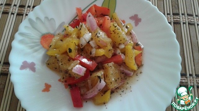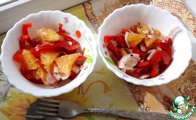Апельсин у меня был сладкий и очень сочный, думаю, с кисло-сладким тоже будет хорошо. Апельсин порезала сначала колечками, а потом на треугольнички. Перец - соломкой. Лук процедила через дуршлаг и сполоснула холодной кипяченой водой, чтоб не было уксусного запаха. Все выложила в салатник, полила заправкой.