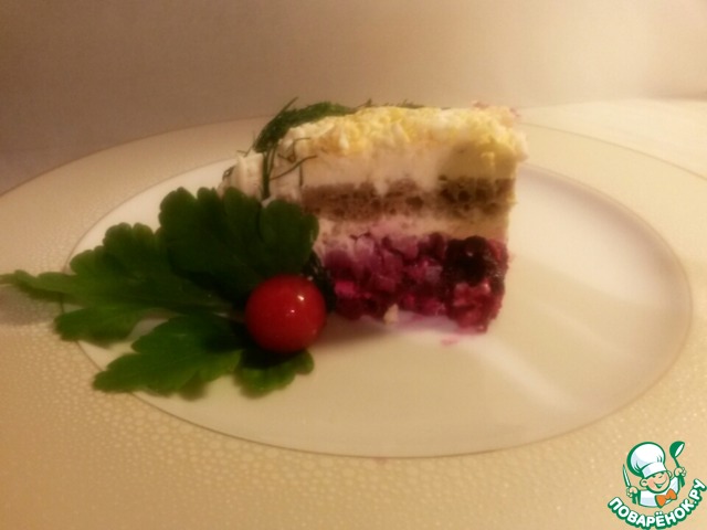Этот яркий закусочный торт не оставит равнодушными любителей селедки "под шубой", очень сытный, с нежным вкусом соленой селедочки и сочной свеклы. Хотите удивить своих близких, порадуйте их таким вот тортиком, который украсит ваш стол и понравится близким и друзьям.