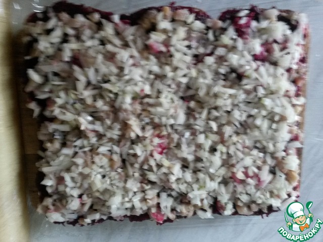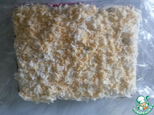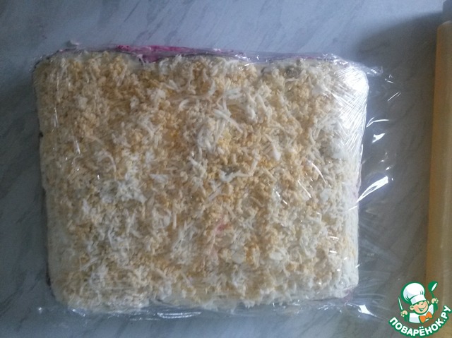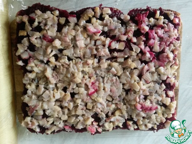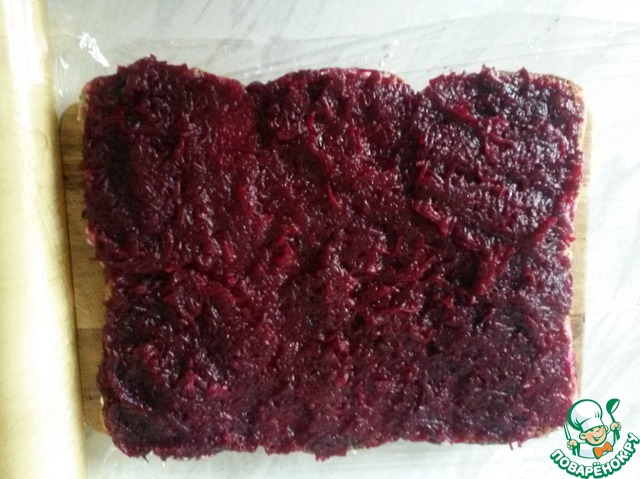 Свеклу натираем на мелкой терке и выкладываем ее следующим слоем