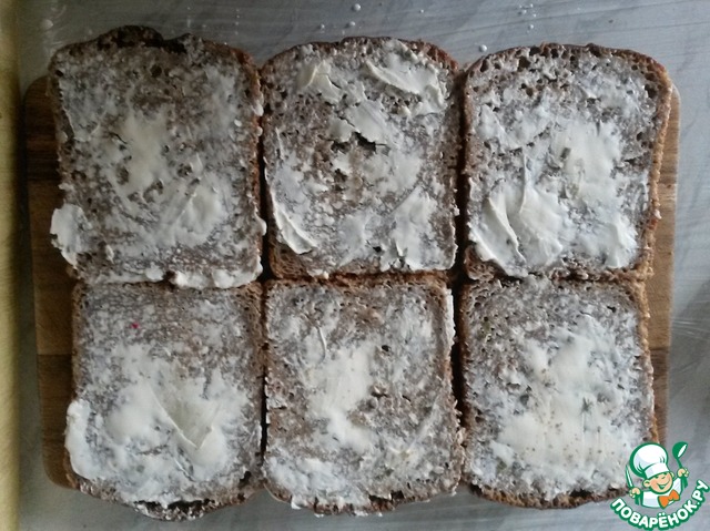 Смазать хлеб тонким слоем творожного сыра, половина порции 100 г