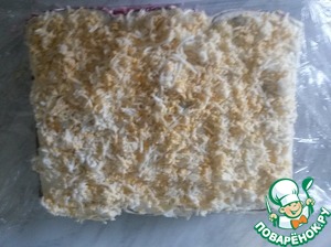 Натереть на мелкой тёрке яйца и посыпать ими верх торта