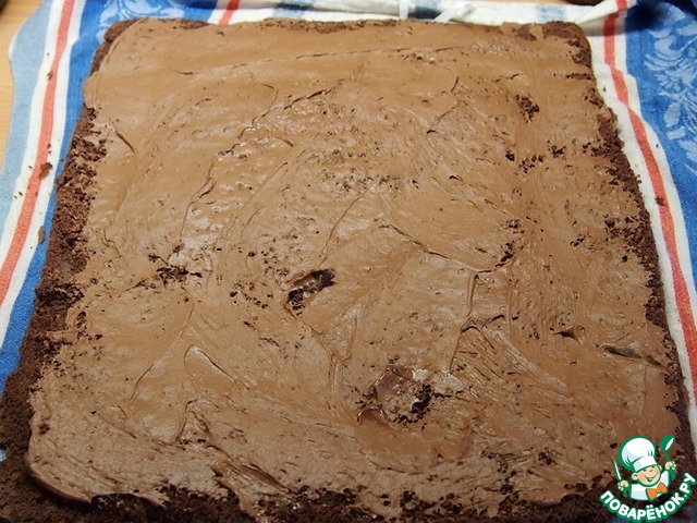 Развернуть полотенце с рулетом, намазать бисквит кремом. Свернуть рулет.