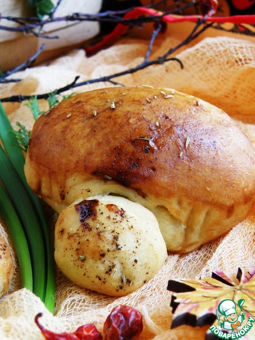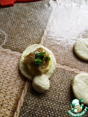 Накрывать начинку вторым кружком и формовать «грибочек». Можно лепить из одного кружка, складывая на манер вареника. Или просто лепить пирожки.