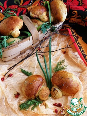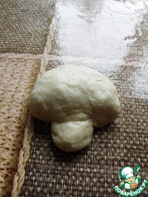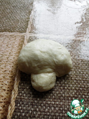 Тесто раскатать в пласт толщиной в 1,5 см. Вырезать небольшие кружки- стаканом в самый раз. Из остатков теста скатать ножки. Заготовки прикрыть пленкой чтоб не сохли. Класть на кружок «ножку гриба», затем ложку пюре, сверху кусочек гриба и щепотку лука.
