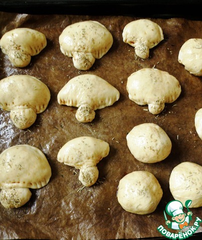 Выпекать в разогретой до 200 градусов духовке. В середине выпекания смазать пирожки еще раз – но уже только шляпки.