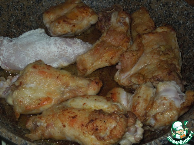 Смешиваем в тарелке муку и соль с перцем, обваливаем в этой смеси куски кролика.