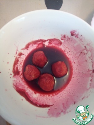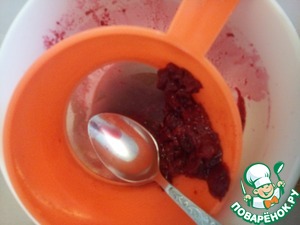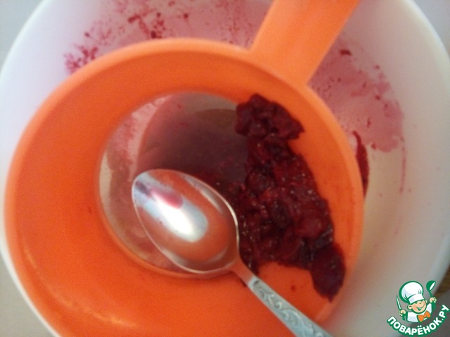 • Размораживаем вишню и выдавливаем сок. Я использовала сито. Вообще можно использоваль сок свеклы или малины.