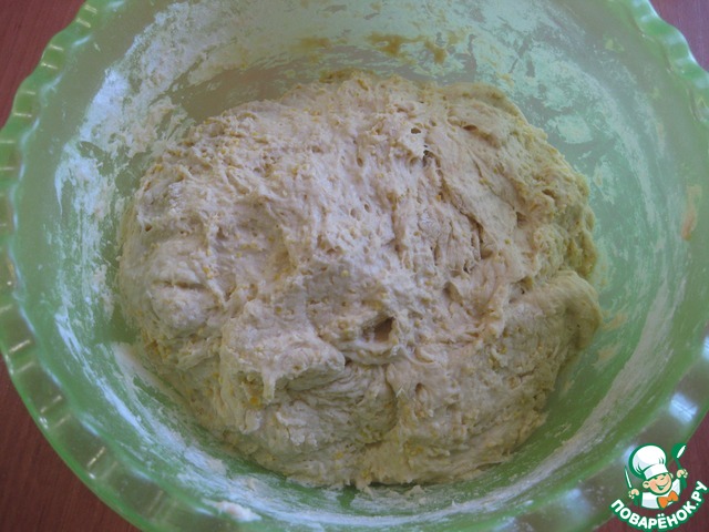 Добавляем кукурузную муку и пшеничную, - пшеничную сразу всю не добавляйте, может понадобиться ее меньше или наоборот чуть больше, - все зависит от качества муки