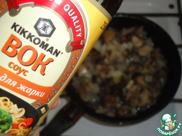 Грибы и лук нарезать произвольно, пережарить, добавив соевый соус, перец.