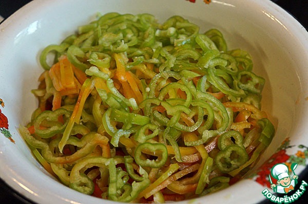 Оба перца освободить от семян и перегородок, порезать кольцами или полукольцами.