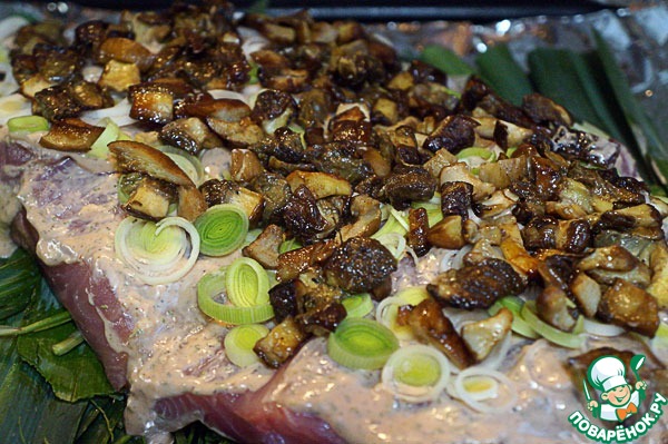 Полить соусом так, чтобы он покрывал все филе, сверху выложить кольца порея.