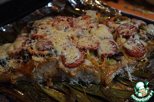 Противень застелить фольгой, на нее выложить подушкой зеленую часть порея. Филе карпа уложить кожей вниз на подушку из порея.
