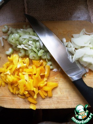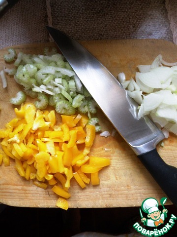 Слегка обжарить на масле лук, добавить перец и сельдерей. Тушить, помешивая, пару минут.
