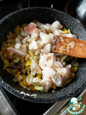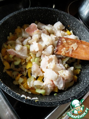 Филе рыбы нарезать кубиками, овощи тонко нашинковать.