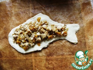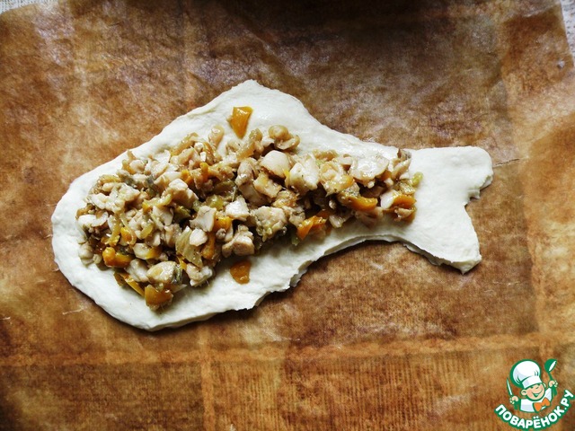 Выложить начинку на нижний слой, который предварительно чуть присыпать крахмалом.