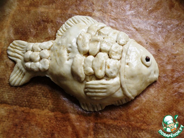Подошедшее тесто обмять и раскатать пласт толщиной в 1,5 см. Разделить пласт пополам, вырезать по трафарету контур рыбы.