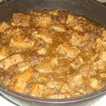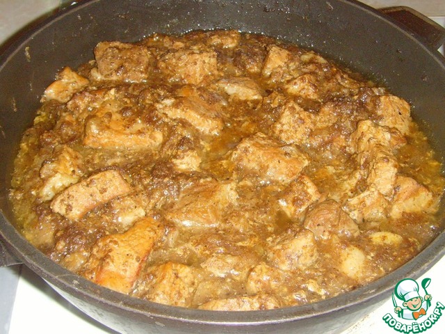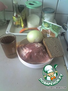 Мясо нарезать и обжарить с луком, залить пивом, добавить специи, тушить до готовности, в конце добавить раскрошенный хлеб.