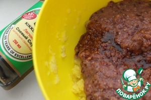 Картошку соединяем с фасолевой смесью, добавляем соевый соус. Солим, перчим.