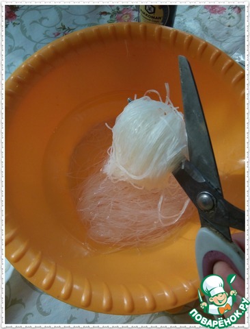 Фунчозу режем ножницами на несколько частей для удобства.
