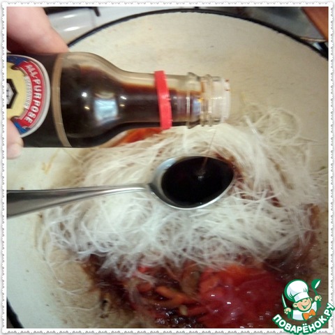 Хорошо перемешиваем овощи, фунчозу и специй в казане, и прогреваем еще несколько минут. Пробуем на вкус, возможно потребуется добавить еще соевого соуса или сока цитрусовых.