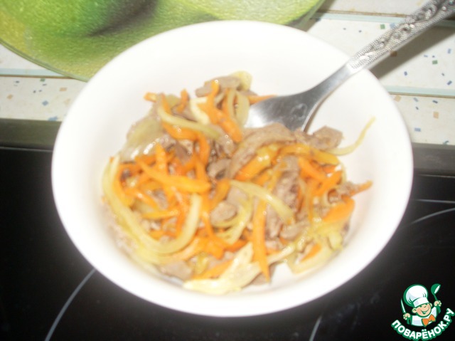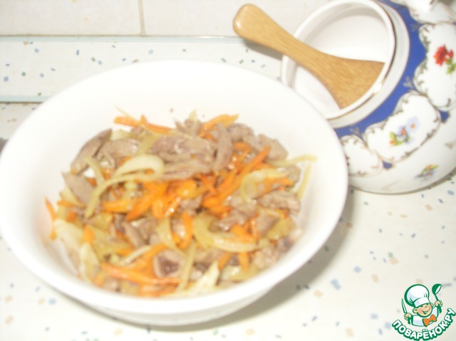 Пока лучок маринуется, ставим отваривать сердечки (до мягкости, примерно минут 40-45). Охлаждаем и нарезаем соломкой
